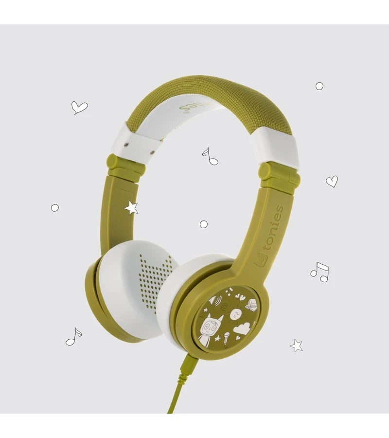 Meet the Tonies Headphones! These foldable, durable, kid-safe, volume-limiting headphones come in six colors to match your Toniebox. Each headphone set includes a matching sticker set and a detachable audio cable with a BuddyJack splitter for sharing storytime with up to four sets of headphones from a single Toniebox.