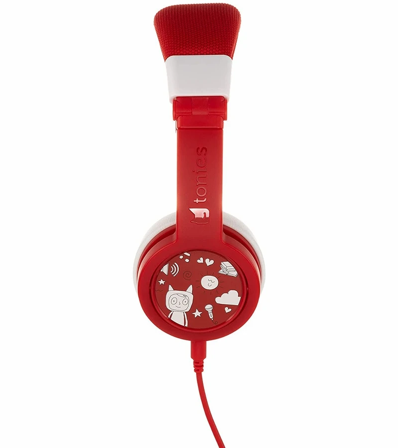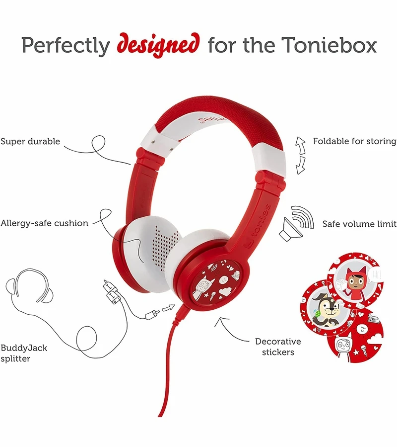 Meet the Tonies Headphones! These foldable, durable, kid-safe, volume-limiting headphones come in six colors to match your Toniebox. Each headphone set includes a matching sticker set and a detachable audio cable with a BuddyJack splitter for sharing storytime with up to four sets of headphones from a single Toniebox.